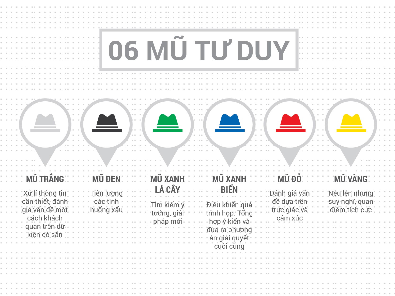“6 chiếc mũ tư duy” là một công cụ trợ giúp tư duy được Edward de Bono giới thiệu trong cuốn “6 Thinking Hats”. Đây là một phương pháp cực kỳ hiệu quả, giúp bạn đánh giá sự việc từ nhiều góc nhìn khác nhau để đưa ra quyết định tốt hơn. Nhờ vậy, bạn sẽ hiểu rõ hơn mọi ngóc ngách của sự việc, nhận diện được những nguy cơ và cơ hội mà bình thường bạn có thể không chú ý đến.