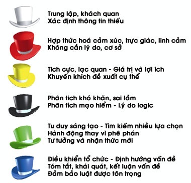 Lưu ý: Thông thường, người chủ trì cuộc họp là người đội chiếc mũ xanh da trời trong suốt cuộc họp. Chiếc mũ xanh da trời là chiếc mũ đặt vấn đề, điều khiển tư duy mọi người trong cả cuộc họp, để tất cả phải sử dụng đúng chiếc mũ vào đúng lúc cần thiết, và cuối cùng cũng kết thúc cuộc họp với chiếc mũ xanh da trời.