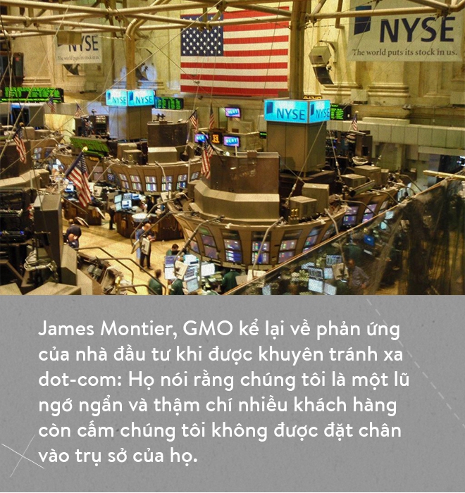 Tệ hại hơn, giữ cái đầu tỉnh táo trong thời đại điên cuồng sẽ buộc bạn phải trả giá đắt. Tính đến đầu năm 2000, Jean-Marie Eveillard mất tới 2/3 khối tài sản quản lý. Quỹ Tiger Funds của Julian Robertson từ chỗ gia tăng quy mô gấp 85 lần trong vòng 3 thập kỷ trước đó phải đóng cửa ngay trước khi bong bóng vỡ. Trong vòng vài năm cuối thập niên 1990, khối tài sản được quỹ GMO của huyền thoại Jeremy Grantham quản lý sụt giảm tới 45%. Điểm chung của các quỹ này: họ khuyến cáo nhà đầu tư tránh xa dot-com.
