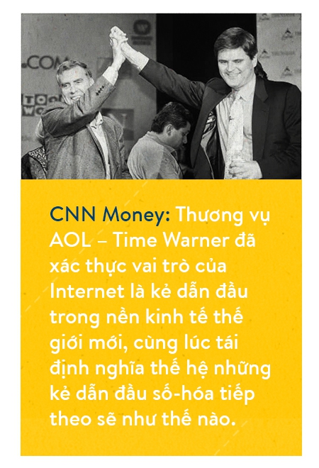 Điều này có nghĩa rằng dòng tiền sẽ sớm sụt giảm, nhưng thế giới hi-tech vẫn bình chân như vại. Ngày 10/1/2000, America Online tuyên bố sáp nhập với Time Warner trong thương vụ trị giá kỷ lục: 163 tỷ USD. Còn điều gì có thể biểu trưng cho sức mạnh khổng lồ của Internet hơn nữa, khi một nhà cung cấp dịch vụ Internet dial-up mua lại một đế chế truyền thông?