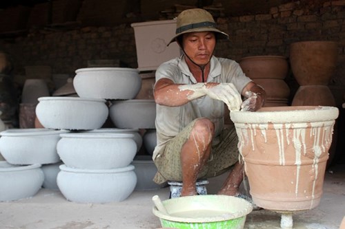 Để làm ra sản phẩm, ban đầu người thợ phải nhào, nặn ra lớp đất sét dẻo, dày khoảng 2 cm đắp lên bề mặt khuôn mẫu.