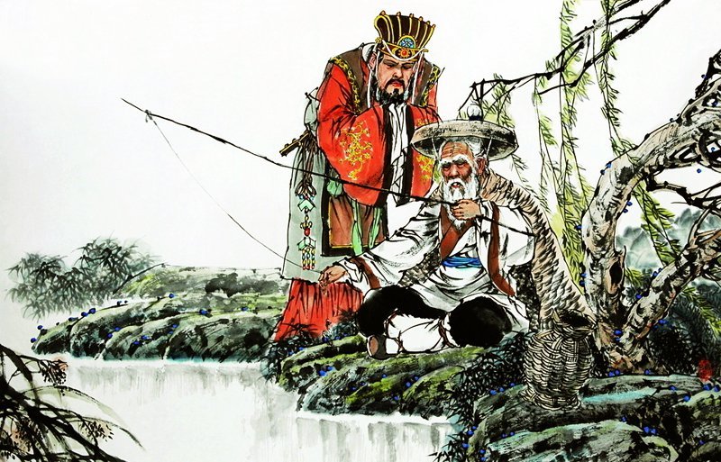 Tương truyền rằng, sau nhiều năm ngồi câu cá chờ thời cơ bên bờ sông Vị Thủy, đến năm 72 tuổi Khương Tử Nha mới gặp được Tây Bá Hầu Cơ Xương, tức Chu Văn Vương sau này. Cơ Xương cho rằng Khương Thái Công là bậc kỳ tài nên lập tức mời ông lên xe theo mình, đồng thời cũng bái ông làm thầy. Khương Tử Nha bấy giờ mới bắt đầu con đường “dựng Chu diệt Thương” của mình.