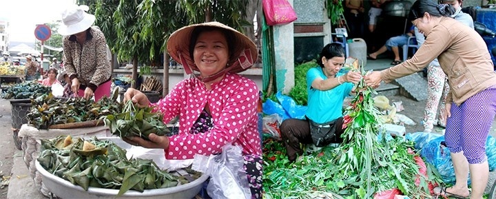 Chợ ngày Tết Đoan ngọ bán đầy bánh tro, lá xông - Ảnh: sưu tầm