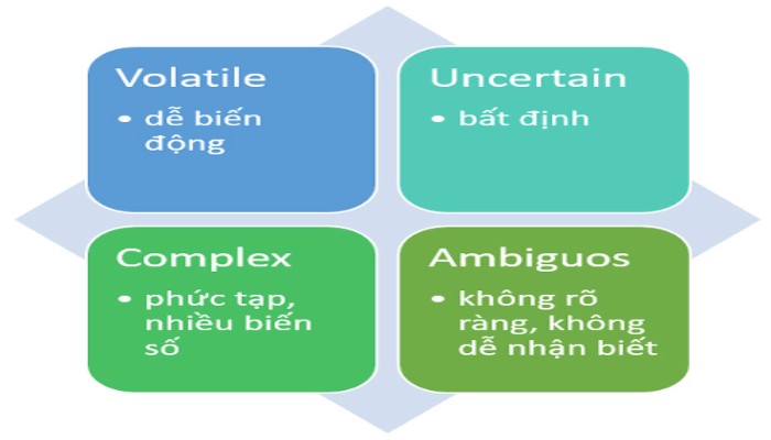 VUCA là tên viết tắt của các từ trong quan điểm cho rằng môi trường kinh doanh luôn phải đối mặt với: nhiều biến động (Volatility), bất định (Uncertainty), phức tạp (Complexity) và mơ hồ (Ambiguity).